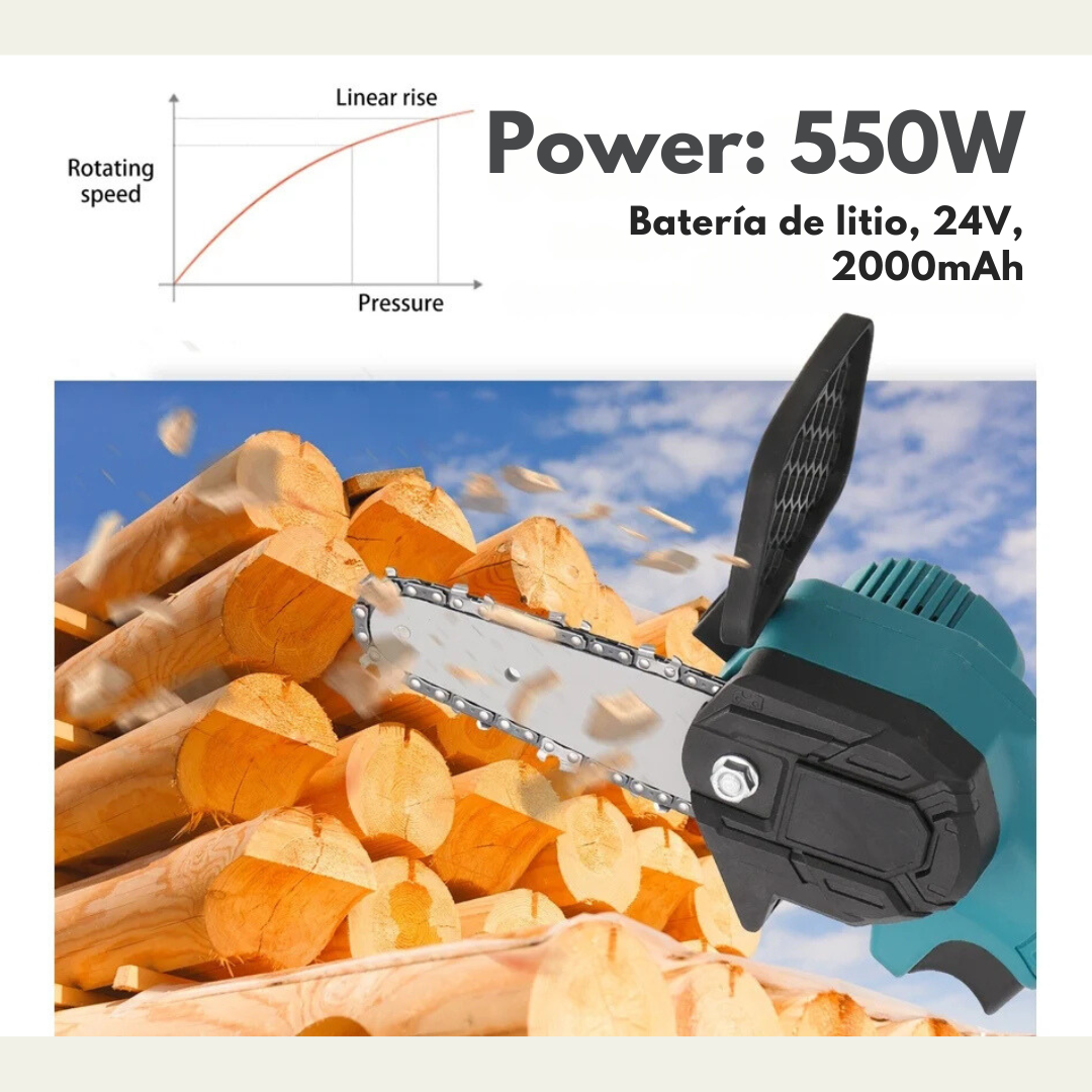 Gracias a sus 2 baterías de litio de 24V, 2000mAh y 550W, la ELECTRIC MINI CHAINSAW, es potente y con un tiempo de trabajo de 4 horas. Esto te permitirá realizar una buena parte del trabajo sin tener que parar para recargar su batería.